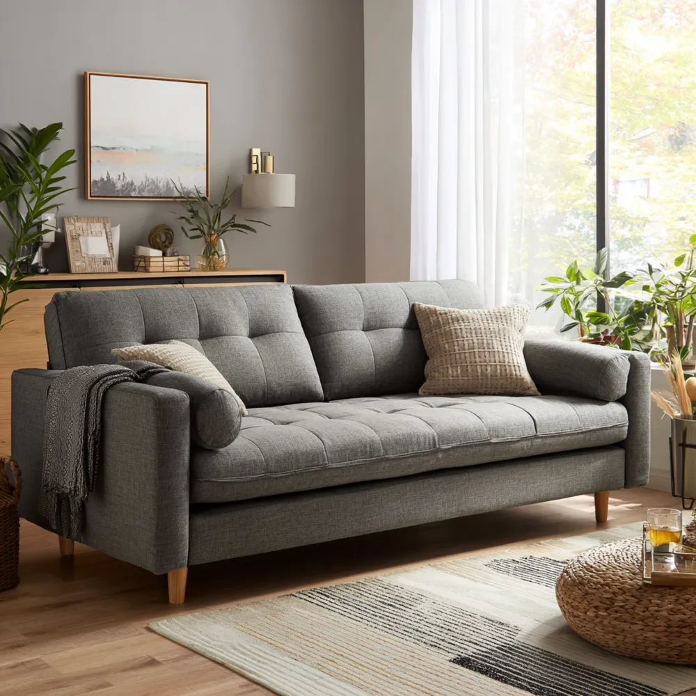 Material und VerarbeitungGefertigt aus hochwertigem Stoff in Dunkelgrau, bietet das Sofa eine weiche und komfortable Sitzfläche mit robusten Holzfüßen.
