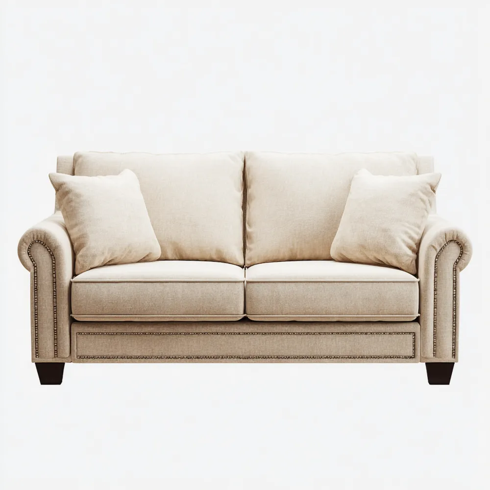 Material und VerarbeitungDas Sofa ist mit einem hochwertigen Stoff in Cremefarbe bezogen, der langlebig und pflegeleicht ist. Der Rahmen besteht aus massivem Holz für zusätzliche Stabilität.
