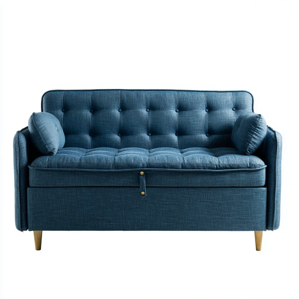Material und VerarbeitungHergestellt aus strapazierfähigem blauen Stoff mit einer weichen Polsterung, bietet dieses Sofa Komfort und Langlebigkeit.