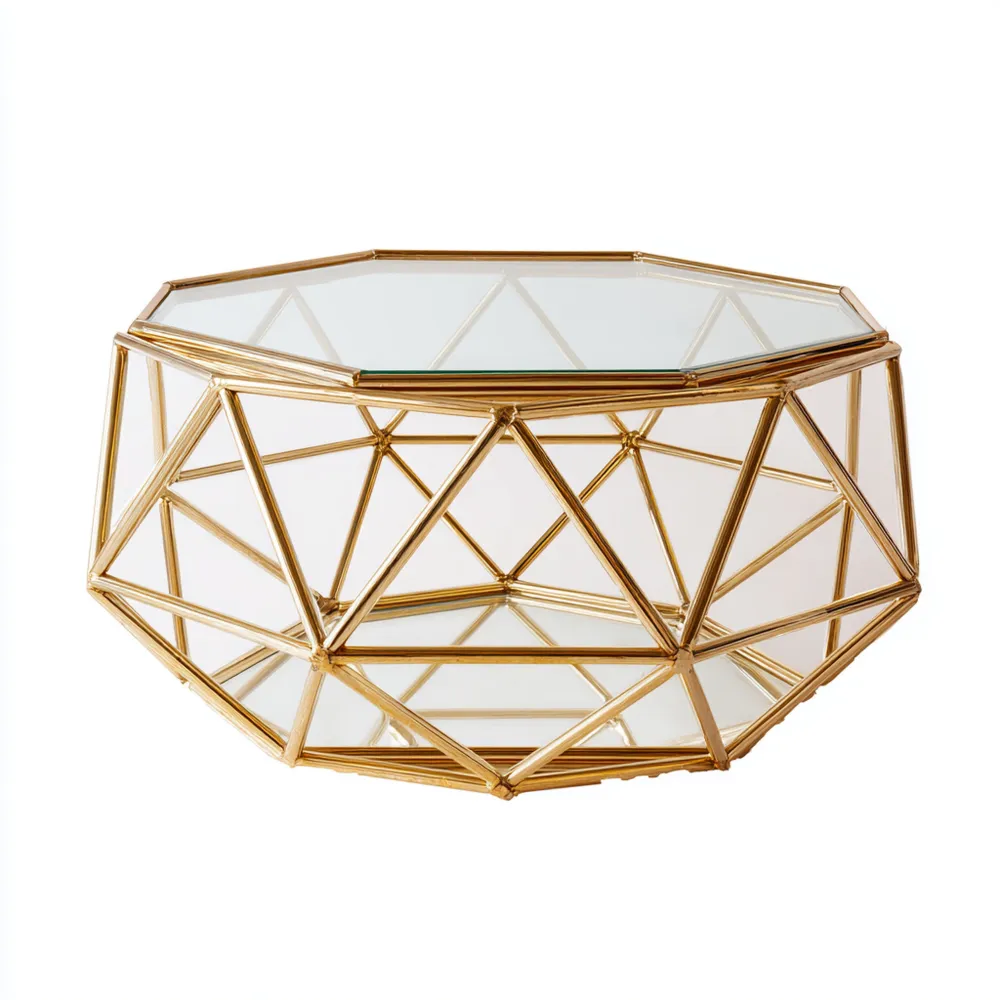 ProduktbeschreibungDieser stilvolle Couchtisch mit einer Glasplatte und einem geometrischen Metallrahmen in Gold bietet eine moderne Ästhetik für jedes Wohnzimmer. Die Maße betragen 80 cm im Durchmesser und 40 cm in der Höhe.
